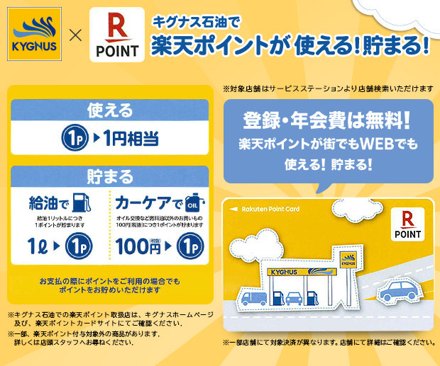 • ・キグナス石油での楽天ポイント取扱店は、キグナスホームページ及び、楽天ホームページにてご確認ください。