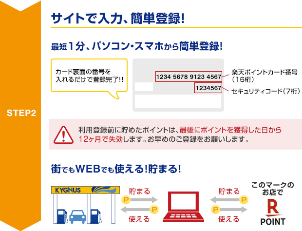 • ・楽天ポイントカードを利用登録されないまま12ヶ月経過したポイントは失効となりますので、上記のサイトにて早めに利用登録を行ってください。
